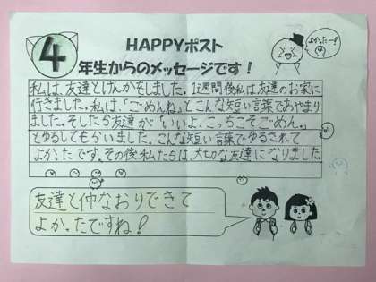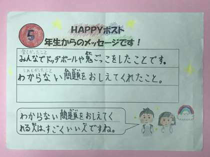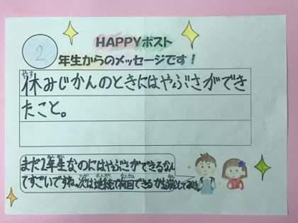 児童会によるHAPPY(ハッピー)ポスト・メッセージ。HAPPYポストに届いた西三国小学校のみんなのHAPPYを紹介します。