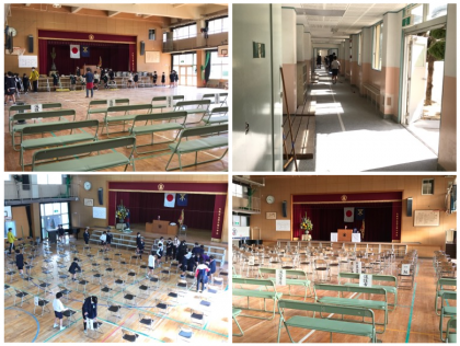 校舎のすみずみまできれいに掃除したり、会場となる講堂では椅子をいったん移動させ、床をきれいにして、セッティングです。