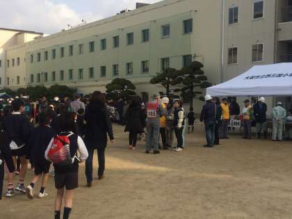 8時半に各町会ごとに集合、点呼し、並んで学校まで避難してきました。教職員、PTAのほか、警察、セーフティー淀川からも地域を見回ってくださいました。