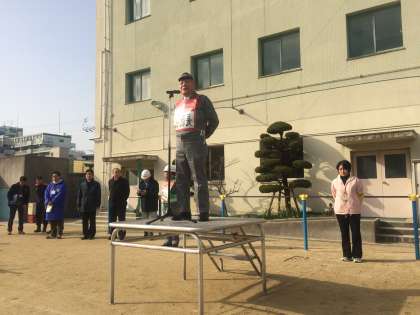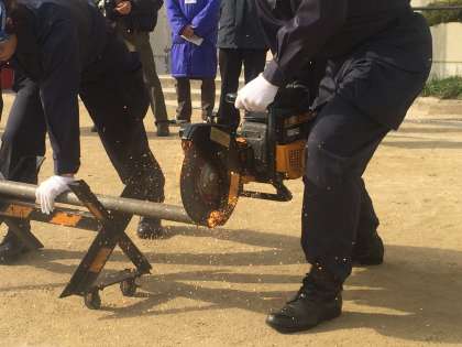 ほぼ定刻に11の町会が集まり、9時から開会式。防災部長などのあいさつの後、消防署からは、災害時に鉄のパイプなどを切断する様子を見せていただきました。区役所からは、防災クイズがあり、地震に備えて再確認できました。