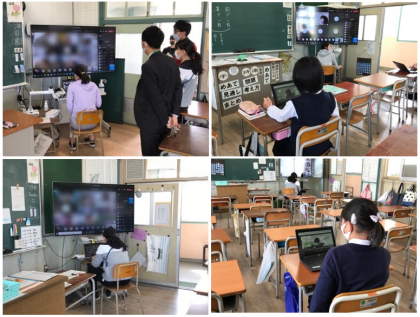 今日は、5年生が、持ち帰った一人一台端末を使って双方向通信のテストを行いました。
