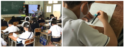分度器の使い方に慣れていく段階で、分度器を動かす人やプリントを動かす人、中には自分の体を動かして角度を測っていました。