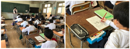 3年生の理科では、これまでの復習をしていました。虫めがねの使い方や自然の中での生き物の様子など、プリントをふり返りながら、先生と一緒に確認していました。