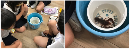 2年生の生活の時間。教室にザリガニややってきました。みんなでザリガニの様子を観察しています。