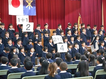 担任の先生は誰かな?楽しみな瞬間でした。6年生のお兄さんからのお祝いの言葉や2年生の歓迎の演技を食い入るように見つめていた1年生。さ、小学校の6年間のスタートです。明日から元気に登校してくださいね!