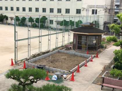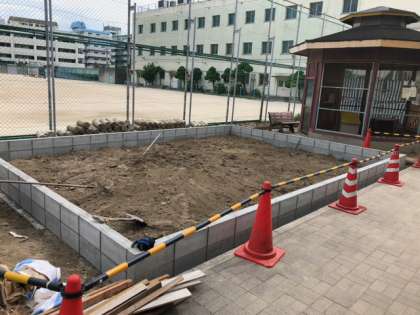 現在、ブロック塀で囲む作業が終わり、園の全体像が見えてきました。この後は、新しい土を入れ、学習園の完成です。