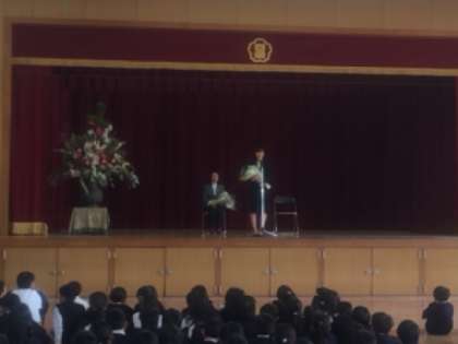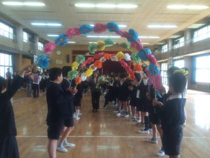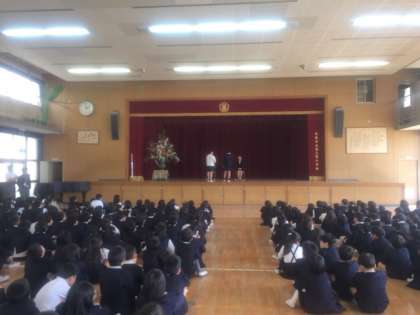 今日の5時間目、離任式を行いました。6人の教職員の方が転勤され、お2人の先生があいさつに来てくださいました。6年生の代表児童がお礼の言葉を伝え、花束をお渡ししました。また、全員で「ありがとう」(いきものがかり)のかえ歌で感謝の気持ちを歌いました。