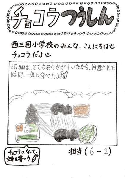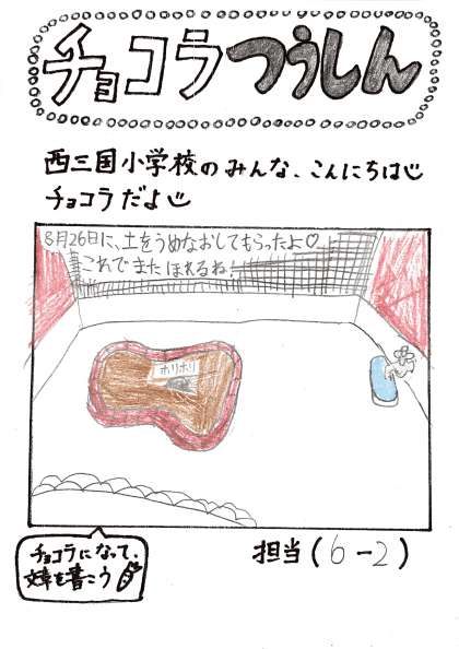 飼育栽培委員会(しいくさいばいいいんかい)のお友(とも)だちが、チョコラ通信(つうしん)を書(か)いてくれたよ。チョコラをすごく上手(じょうず)に描(か)いてくれたよ!