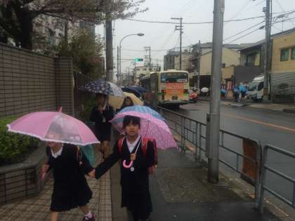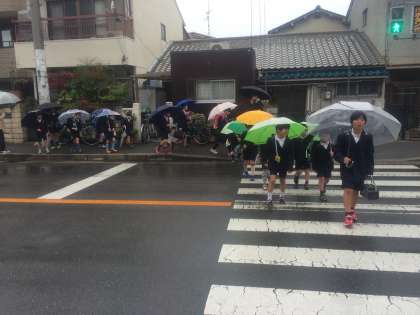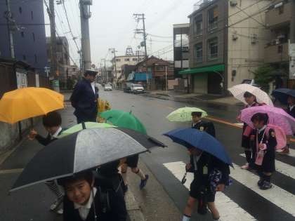 今日は1日雨でした。登校時も傘をさして、班長さんが気遣いをしながらなかよく登校。当番の先生や三国駅前の交番のお巡りさんも見守りをしてくださっています。