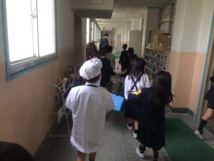 給食当番が、1階の給食室まで返しに行きます。きちんと並んで、階段では声をかけ合って、ゆっくり慎重に運んでいます。