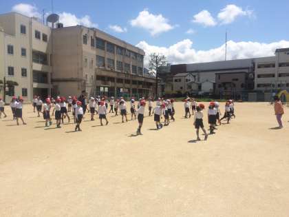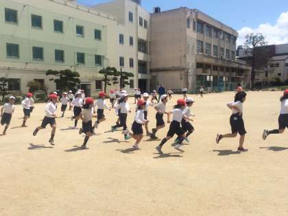 晴れ間が見えたので、学年合同体育です。準備運動の後、久しぶりに運動場をみんなで走りました。風がちょっと冷たかったけれど、みんな元気いっぱい!新学期が始まっても雨が続いていたので、とってもうれしそうでした。