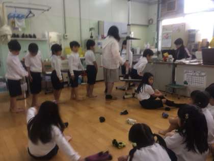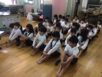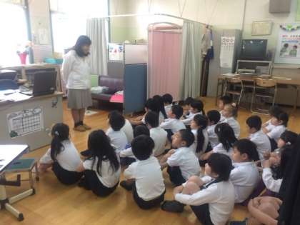 身長、体重、座高を測りました。その前に、養護教諭のM先生から、保健室での注意事項や話を聞くときの姿勢、教室へ戻るときは、「忍者になって(音を立てずに静かに)」などを聞きました。体育座りの時もしっかり背筋を伸ばすと美しく、腹筋もつきます。