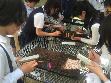 休み時間になり、飼育栽培委員会の子ども達が集まってってきました。ボランティアさんたちが、種のまきかたをやさしく教えてくださいました。竹串を使って小さなポットの中に1粒ずつ入れるのは、なかなか細かい作業でしたが、上手にできました。毎日水やりを忘れずに世話をして、美しい花を咲かせたいですね。