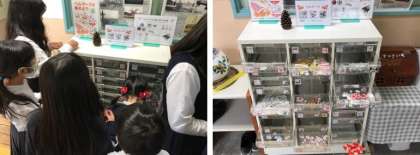 本校PTAではベルマーク活動をしています。この度、ベルマークの集める場所を校長室前に変更することに伴い、企業ごとにトレイでわけて集めることなりました。