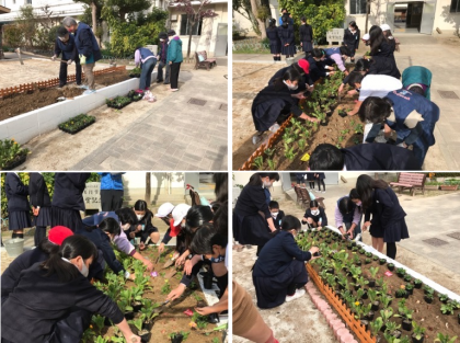 今日は花づくり隊の方々が事前に耕しレイアウトを決めていただいたあと、飼育栽培委員会が15分休みの間に全て植えてくれました。