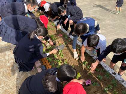 今週(こんしゅう)は飼育栽培委員会(しいくさいばいいいんかい)のお友(とも)だちが地域(ちいき)の方(かた)と一緒(いっしょ)に花壇(かだん)にいっぱい苗(なえ)を植(う)えていたよ!どんな花(はな)が咲(さ)くのか今(いま)から楽(たの)しみだね!