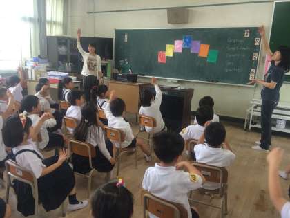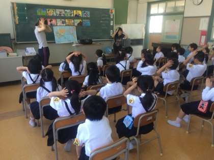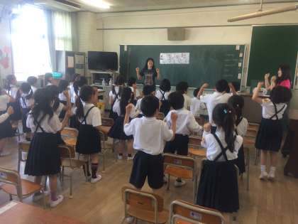 1年生の英語活動がスタートしました。三国地域にお住いのI先生と初めての英語活動です。「3・2・1、イングリッシュタイム!」の魔法がかかると、英語だけの世界です。よく聴き、まねをすることが大切です。歌やリズムに合わせてフレーズを楽しみました。