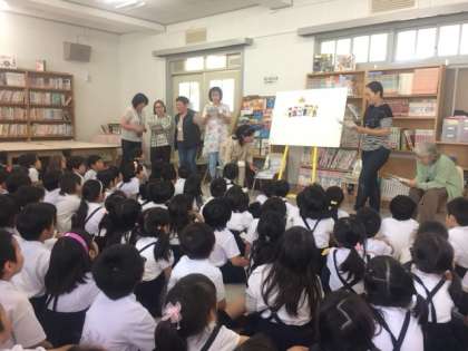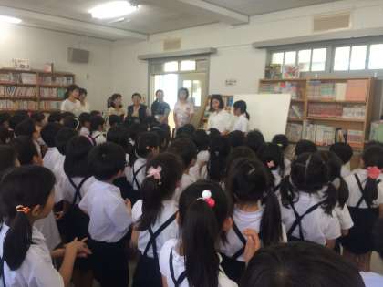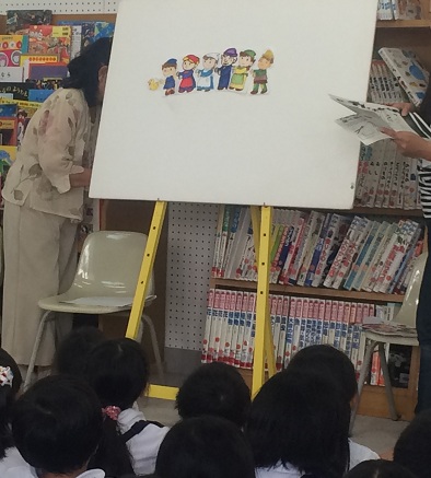 この日は、入学を祝って、パネルシアター「金のがちょう」を見せてくださいました。5,6年生の図書委員会児童も士会などの手伝いをします。