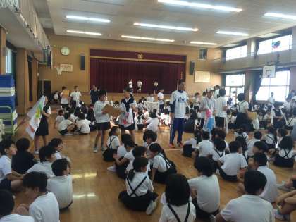 21日の児童集会は、たてわり班ごとに一人一枚カード(手書きのキャラクターで点数が書いてあります)を集め、合計点を競うゲームでした。たてわり班での集会ゲームはこの日が初めてでした。自分の班がどこか迷っている子にやさしく教えたり、点数の集計を手際よくする高学年の姿に下の学年の子どもたちは、頼もしく感じたのでは。