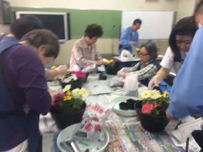 夢ちゃん花苗ボランティアさんたちの寄せ植え講習会を22日、10時から行いました。十三公園事務所の方々と、グリーンコーディネーターのMさんを講師に、ペチュニアやマリーゴールドなどの寄せ植えの仕方を教わりました。ちょっとしたコツでいつまでもきれいな花を楽しむことができるそうです。
