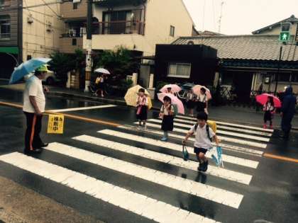 雨の中、今朝も地域の方や淀川警察のおまわりさんが見守りをしてくださいました。ありがとうございます。