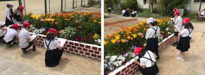 2年生が、生活の時間に花壇の周りで花を観察し、スケッチをしています。みんながじっくり観察し、一生懸命描いてくれているので、満開になったお花もうれしいんじゃないかなかぁ、と思います。