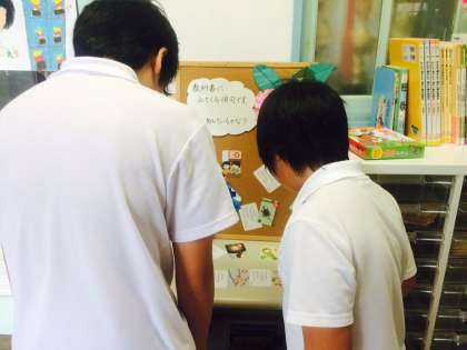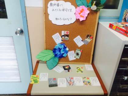 俳句カルタを置いています。教科書に載ってた!この俳句の意味は?など子どもたちが、いろいろ話しながら見ています。