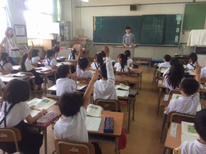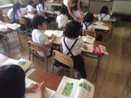 1年生は国語、文を作ろうの学習をしています。教科書のさし絵を見ながらたくさん文を作っていました。
