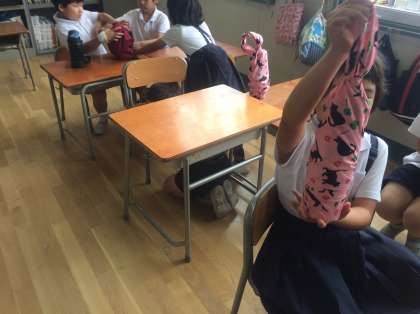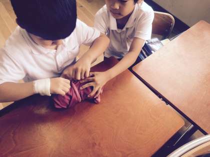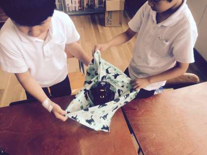 国語の授業で、風呂敷についてかかれている説明文を学習します。先生が用意した風呂敷で水筒を包んでみました。二人で協力して上手に包んでいました。他にどんなものが包めるかな、袋とくらべてみてどうかな、など体験したことをもとにぶんをよんだり、書いたりします。風呂敷は、子ども達に、なじみがうすいと思っていたら、最近は忍たま乱太郎や妖怪ウオッチなどでよく知っているようです。