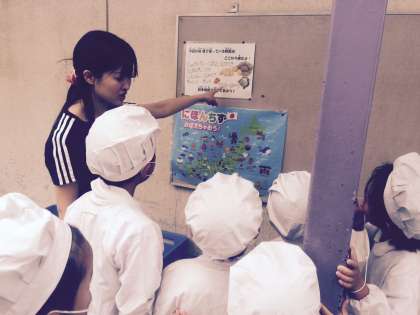 今日の献立は、みんなの好きなハヤシライス。一年生が、給食室前の掲示板を見て、ジャガイモはどこから来たの?にんじんは?セロリは?と地図を見ながら産地を話していました。熊本県と聞いて、くまもんのいるところや!とニッコリ^_^ハヤシライスをしっかり食べた一年生でした。