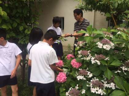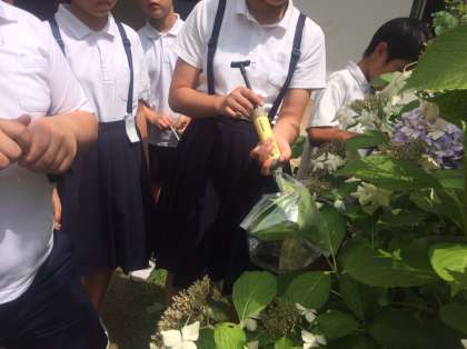 気体検知管を使って植物には、空気のどんな成分が必要なのか、中庭のアジサイを使って実験をしました。