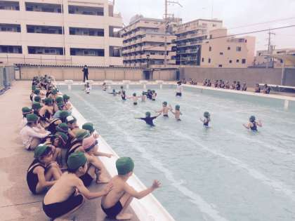 今日は、プール水泳2日目。水を減らしてカニさん歩きをしたり、水慣れの遊びを楽しみました。