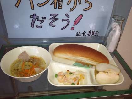 今日のメニューは、キャベツのスープ、エビグラタン、大型コッペパン、豊水なしです。