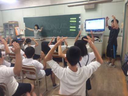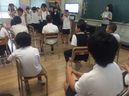 6年生も歌やチャンツで英語のフレーズを。恥ずかしがらず、真似ること、これが大事ですが、6年生もとても素直に声を出したり、体で表現したりしています。