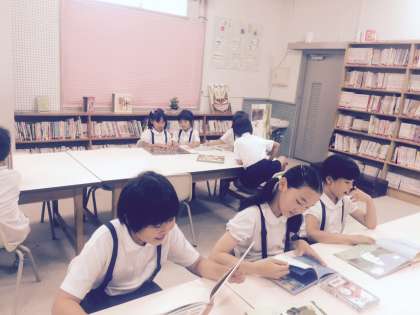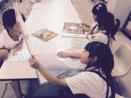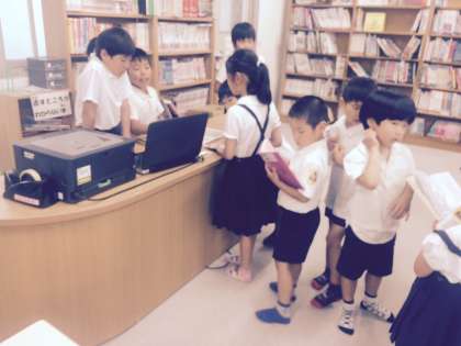 それぞれ、思い思いに好きな本を選んで読んでいます。大型絵本も楽しんで、二人で読んでいます。1年生がたくさん来ていて、貸し出し登録に行列ができていました!