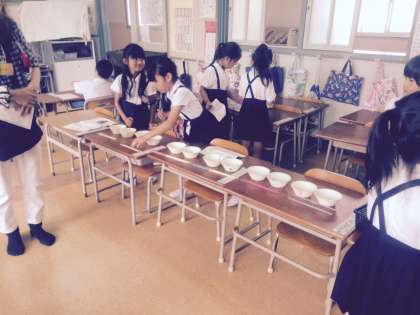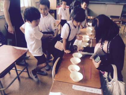 おわんの中の牛乳キャップをとなりに移します。はしやストローを使って写すのですが、意外とストローが難しく、時間がかかりました!