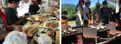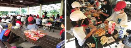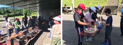 用意していただいた材料で、ホットドックを作ります。アルミホイルで巻いて、牛乳パックに入れて焼きます。