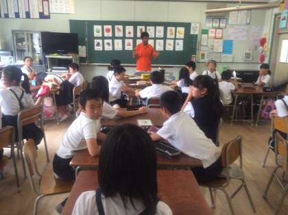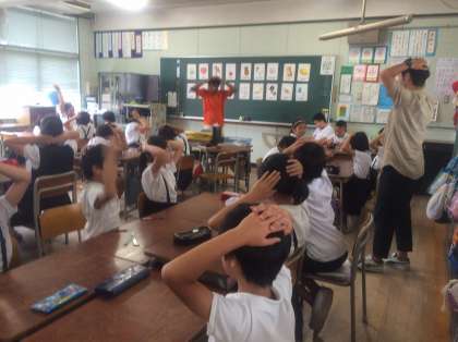 ケヌリー先生と英語を勉強しました。いろいろな単語の中からキーワードを聞き分け、その単語が出たら帽子をとるゲームをしました。くだもの、動物などたくさんある中だんだん聞き取れるようになっていきました。