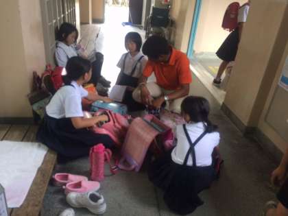 5年生が、子どもの事が大好きなケヌリー先生は、何でもニコニコうなづいて話を聞いてくださいます。廊下でなにやら話しています。
