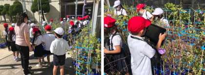 1年生がせいかつの授業でアサガオの観察をしました。夏休みはそれぞれのお家で育てたアサガオには、種もできていましたね。