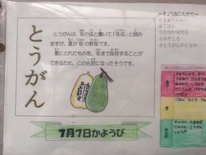冬瓜が出ました。調理員さんが、調理する前に1年生に見せてくれました。食べているものがもとはどんな形や色をしているのかは、なかなかわかりにくいのですが、時々こんな風に写真を貼り出すなどして紹介しています。食べ物にもっともっと興味をもってほしいです。