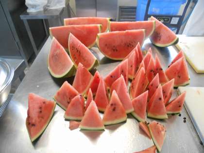 今日は蒸し暑い一日でした。給食にスイカが出ました。1個を64等分すると、どこもみな同じ甘さでおいしいです。暑い日にはぴったりのメニューです。
