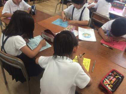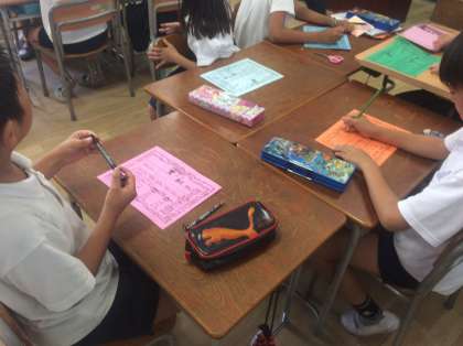 班で友達のよいところを見つけてカードに書いてプレゼントしていました。ちょっぴり照れくさいけれど、うれしそう!