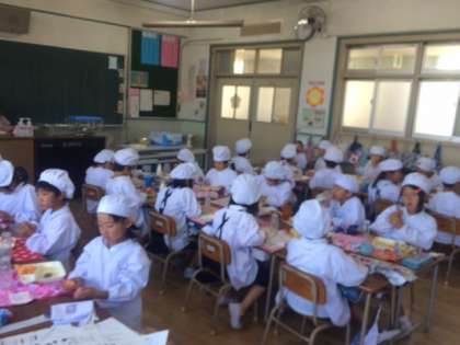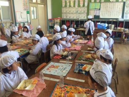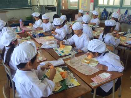 1.2年生の教室を回りました。カレーを食べ終わり、冷凍みかんをたべていました。「しゃりしゃりしておいしい!」「冷たくておいしい!」「頭がキーンとする!」などとおしゃべりしながら楽しく食べました。1学期の給食も後1日です。