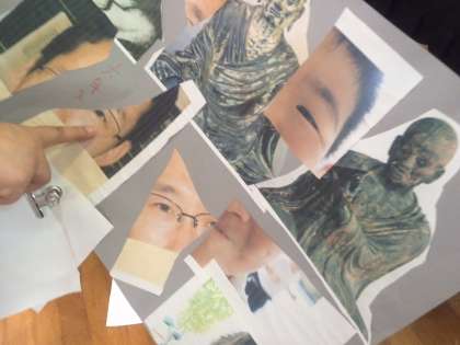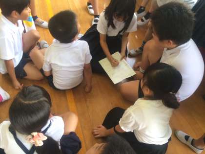 絵あてゲームをしました。学年ごとに、コラージュした絵にかかれている人物をあてます。縦割り班で6学年の合計点を競うゲームです。絵はわずかな時間しか見ることができないので、みんな必死でした。