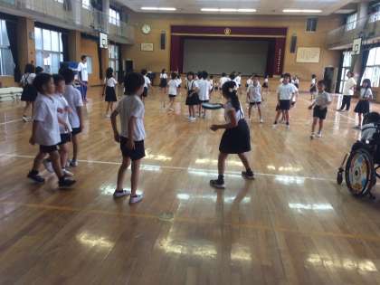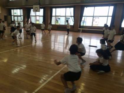 学年合同でフリスビーを楽しみました。2つ同時に投げることもありようく見て投げたり逃げたりして素早く動いています。
