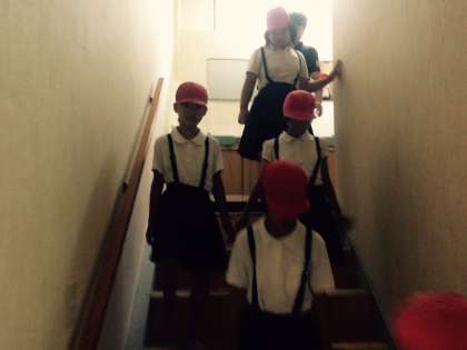 避難訓練をしました。お、は、し、も、のルールは学校と一緒です。
