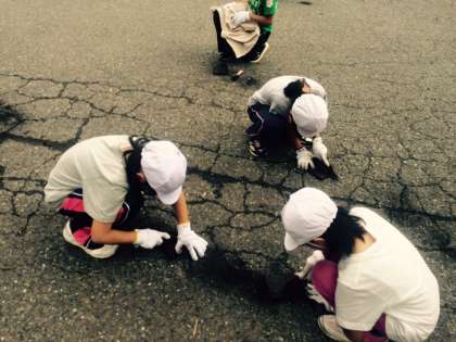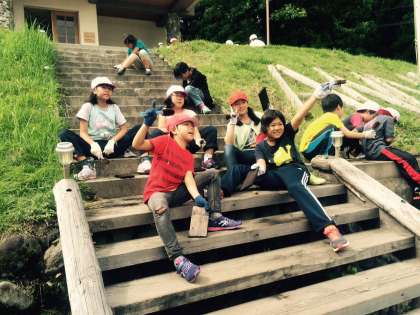 焼き板作りの時間です。ハチ高原の杉は、木目が、細かいという特徴があるそうです。焼き板は、500年以上ももつのうなので、長く思い出の品として残ります。板についた煤を落として、います。