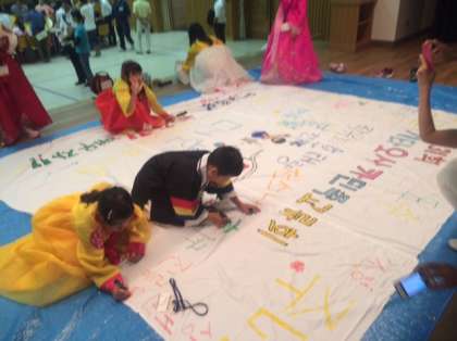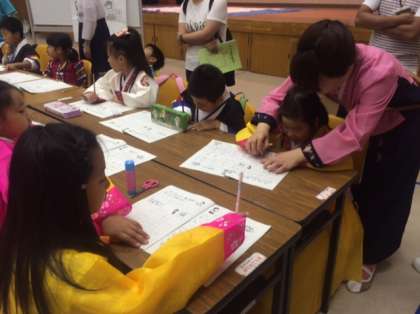 大淀コミュニティーセンターで、北大阪子ども民族交流会が行われています。今年で31回めを迎えます。最初踊りを見せてもらい、それから名前をハングルで書いたりおもちゃを作ったりと初めての体験をたくさんして韓国、朝鮮の文化に触れました。ました。多くの仲間との交流も楽しみました。