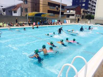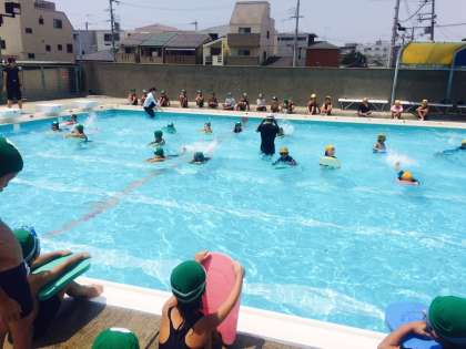 ビート板を持ってバタ足やクロールの練習をしました。水の中は気持ちがいいですが、気温が高くなっているので熱中症に気をつけて指導しています。